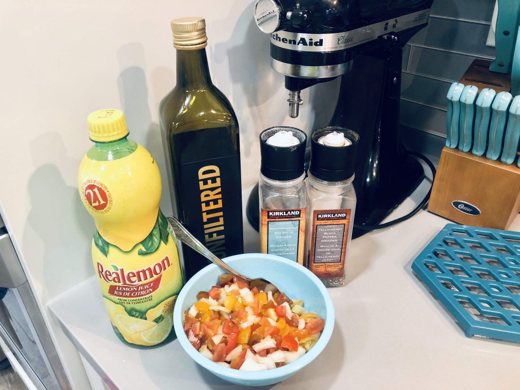 5. Dice one onion and one large tomato. Mix together and season with lemon juice, olive oil, salt and pepper.