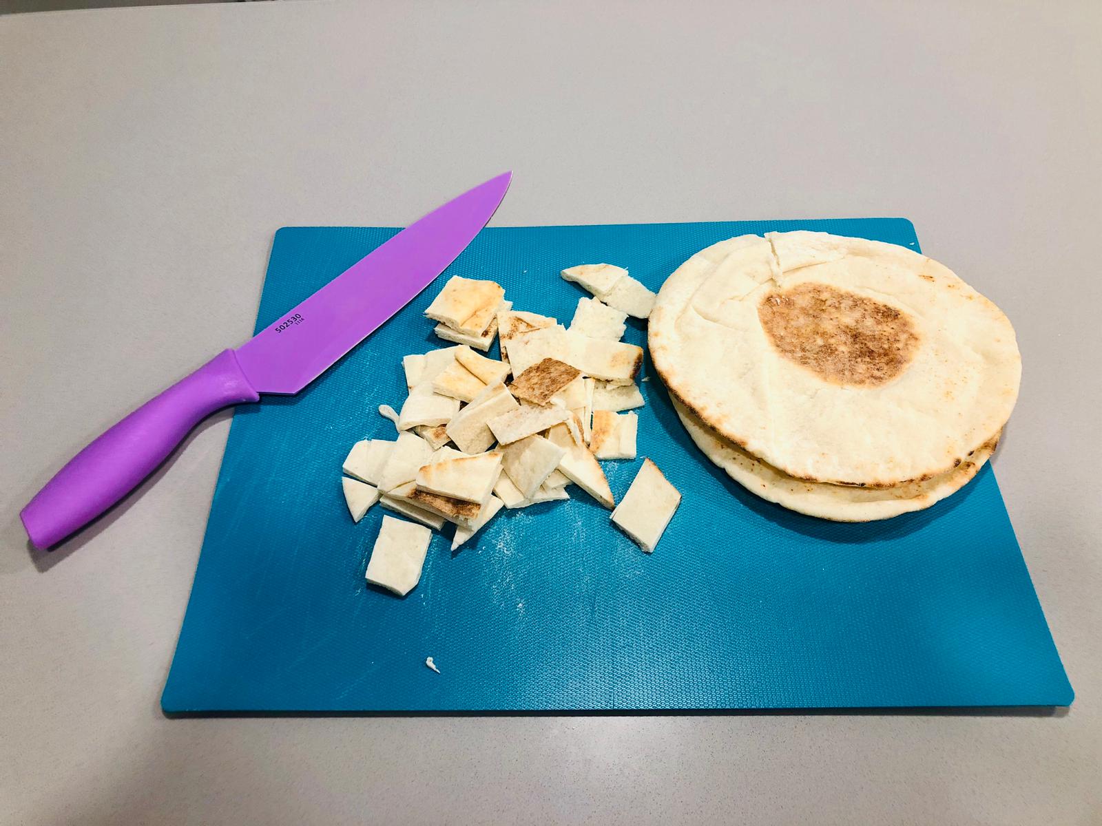 1. Prepare pita crisps by cutting up fresh pita into squares.