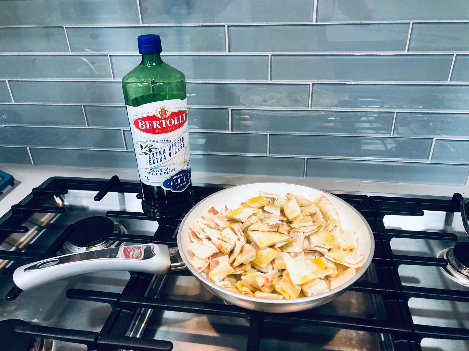 2. In a frying pan, fry pita with olive oil until light brown and crispy. Deep fry for greater flavour. Set aside.