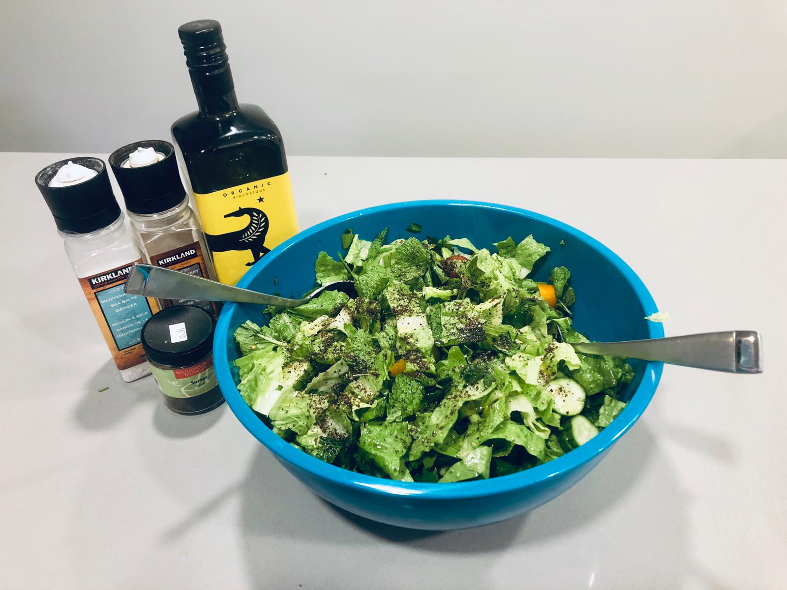 4. Toss salad with a generous amount of poured extra virgin olive oil, sumac, lemon juice, salt and pepper.