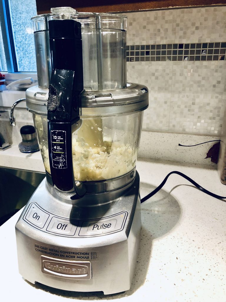 - In the food processor, pulse 12 garlic gloves until fully minced.
