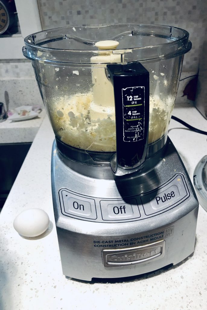 3. As food processor is running, drizzle 2 cups of oil into the top until the garlic resembles a mayo.