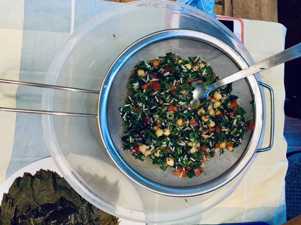3. Place a spoonful of the drained mixture in the middle of each vine leaf and roll tightly using burrito style (tucking in both sides and rolling from front to back).